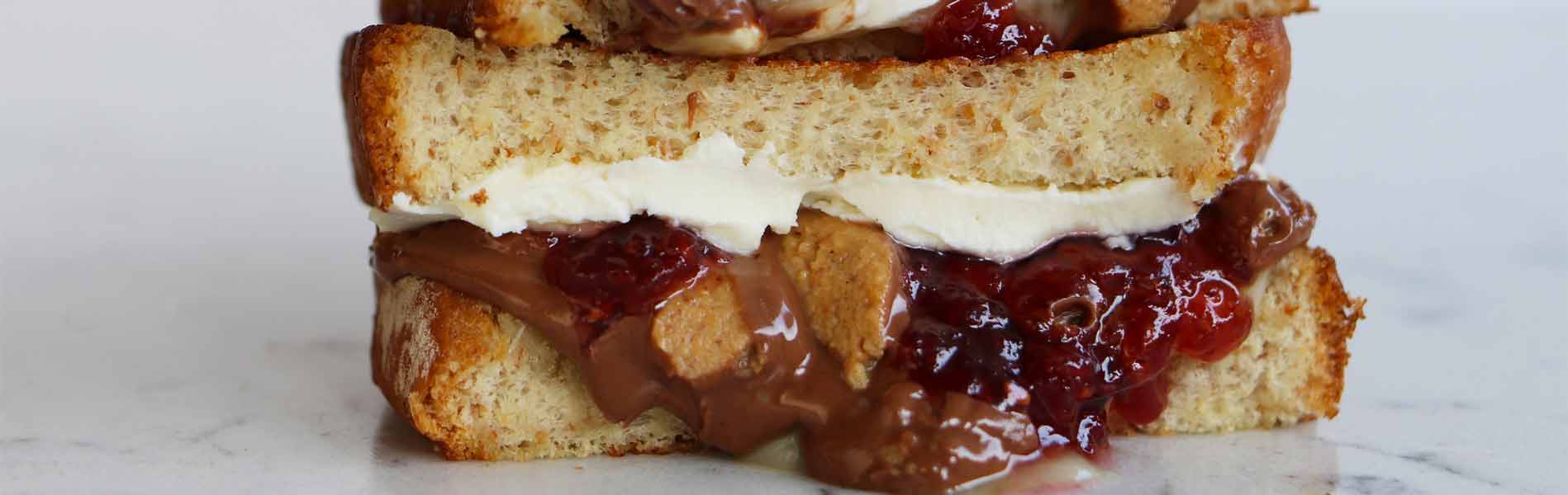 - Begin by smearing the Mascarpone onto one slice of bread. Add chopped chocolate peanut butter candy and raspberry jam. Add the Brie on top and then cover the sandwich with the remaining slice of bread. Evenly smear the butter onto both exteriors of the sandwich and set aside.