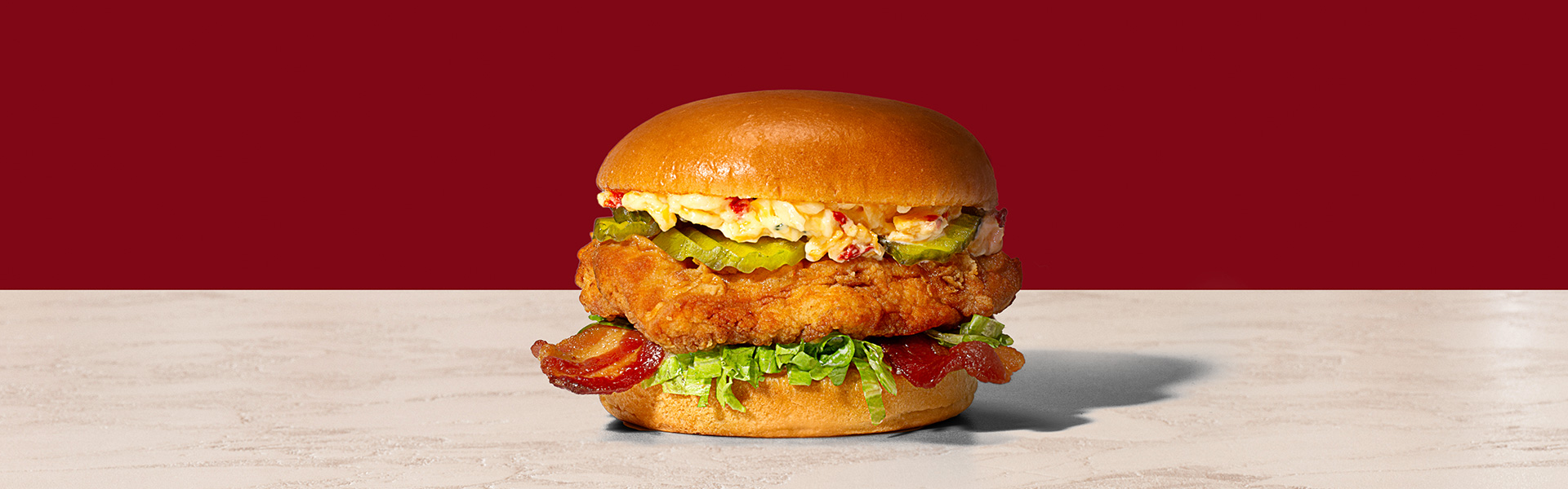- For the sandwich assembly, spread the creole mayo on both insides of buns. On the bottom bun, place the shredded lettuce and bacon. Toss the chicken thighs in the lemon pepper hot sauce and place on top of the bacon. Top the chicken with pickles and pimento cheese, followed by the bun lid.