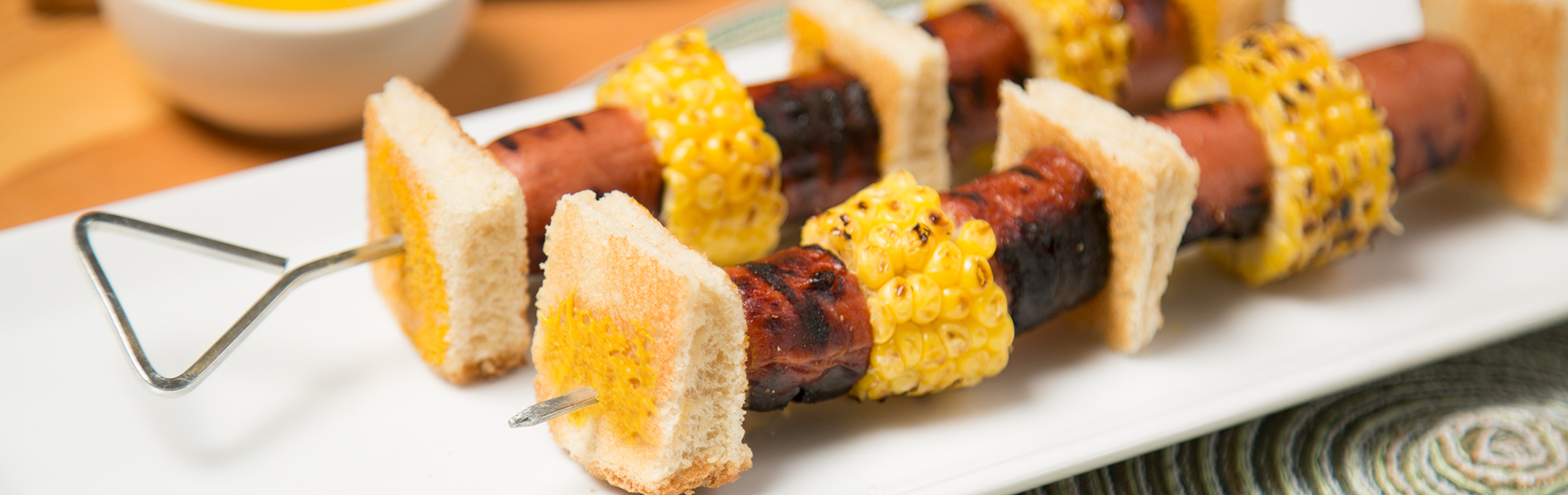 - Skewer ingredients together: toast, dog, corn, dog and repeat once. Cap end with toast square.