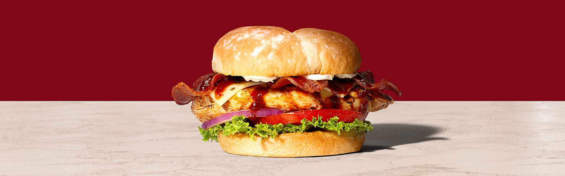 - Remove chicken from the pan and set on the bottom bun on top of the lettuce, tomato and red onion. Place the mayonnaise-spread bun lid on top of melted cheese.