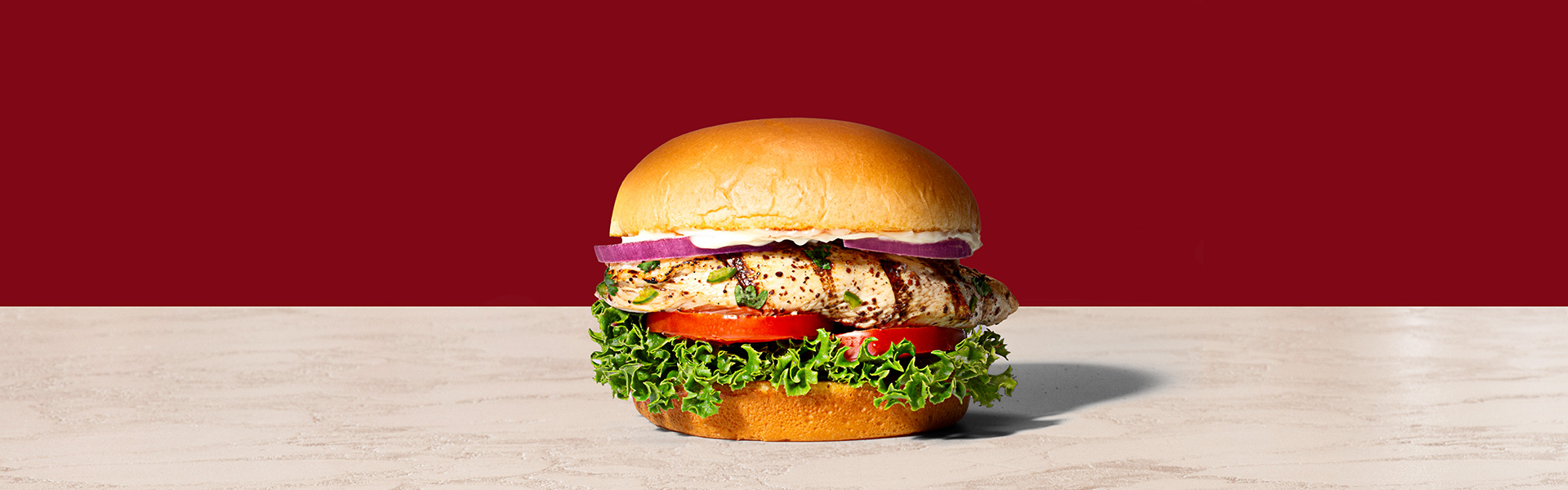 - On the bottom bun, layer the lettuce leaves, tomato slices, chicken breast and a thin slice of red onion. Top with the bun lid, spread with mayo and enjoy!