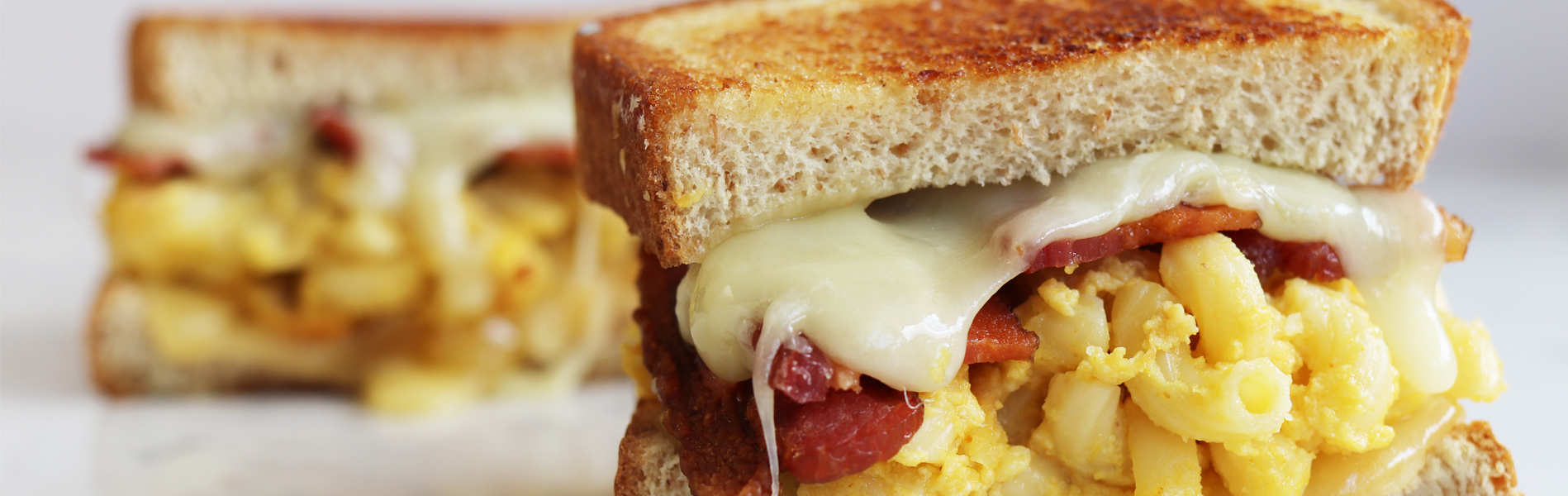 - Grill the sandwich in a cast iron skillet until the bread is golden brown and the Gouda has melted and the Mac n cheese is warm throughout (approximately 5-10 minutes). Remove from heat and let sit for 1 minute before slicing in half.