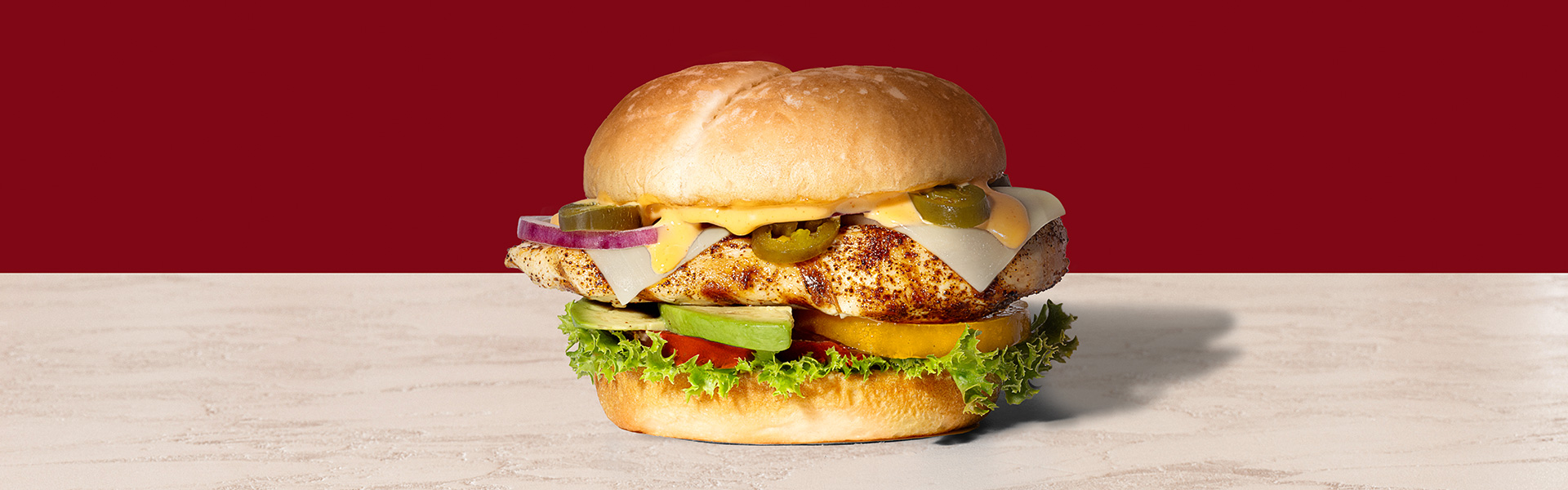 - To assemble the sandwich, spread chipotle mayonnaise on the top bun. On the bottom bun, layer lettuce, tomatoes, avocado and the Mozzarella topped chicken breast. Top with jalapenos, red onions and the bun lid.