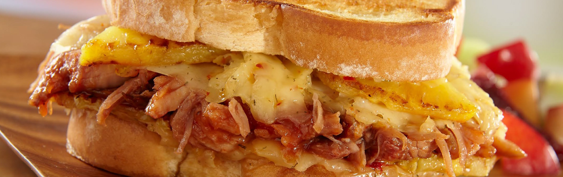 - Build sandwiches. Lay bread on cutting board and spread butter on 1 side of each slice. Flip 6 slices over so butter side is down and layer each with 1 slice of Havarti cheese, 1 scoop pulled pork, a drizzle of Hawaiian barbecue sauce, 1 grilled pineapple slice and a second slice of Havarti cheese. Cap each sandwich with remaining bread slices, butter side up.