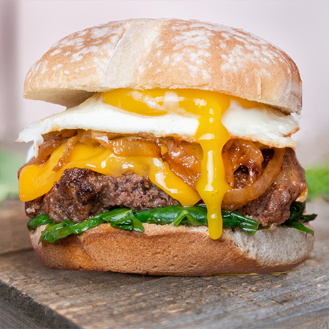 - On each bun bottom, layer spinach, cooked mushrooms and 1 grilled burger patty. Spoon cheesy garlic mushroom sauce over the top, then layer on crispy bacon. Top each with a toasted bun lid and enjoy!
