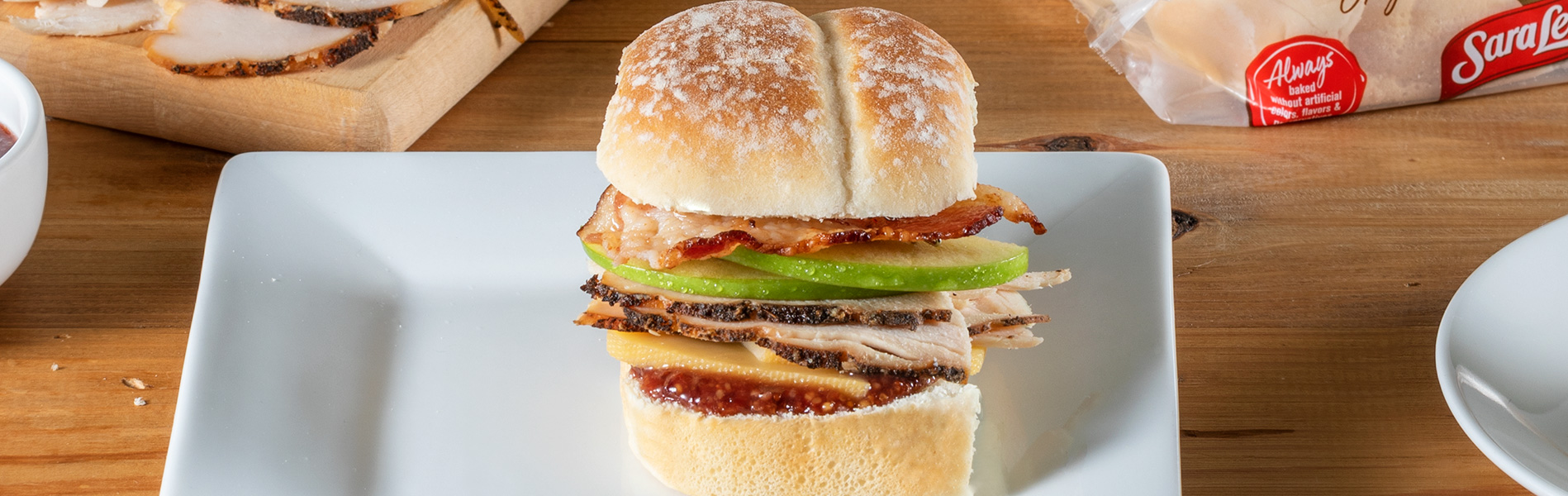 - Spread cranberry mustard on each roll bottom. Top each with 1/2 slice Gouda cheese and desired amounts of roast turkey and apple slices. Arrange 2 half slices of cooked bacon atop apple slices, then cap each sandwich with a roll lid and enjoy.