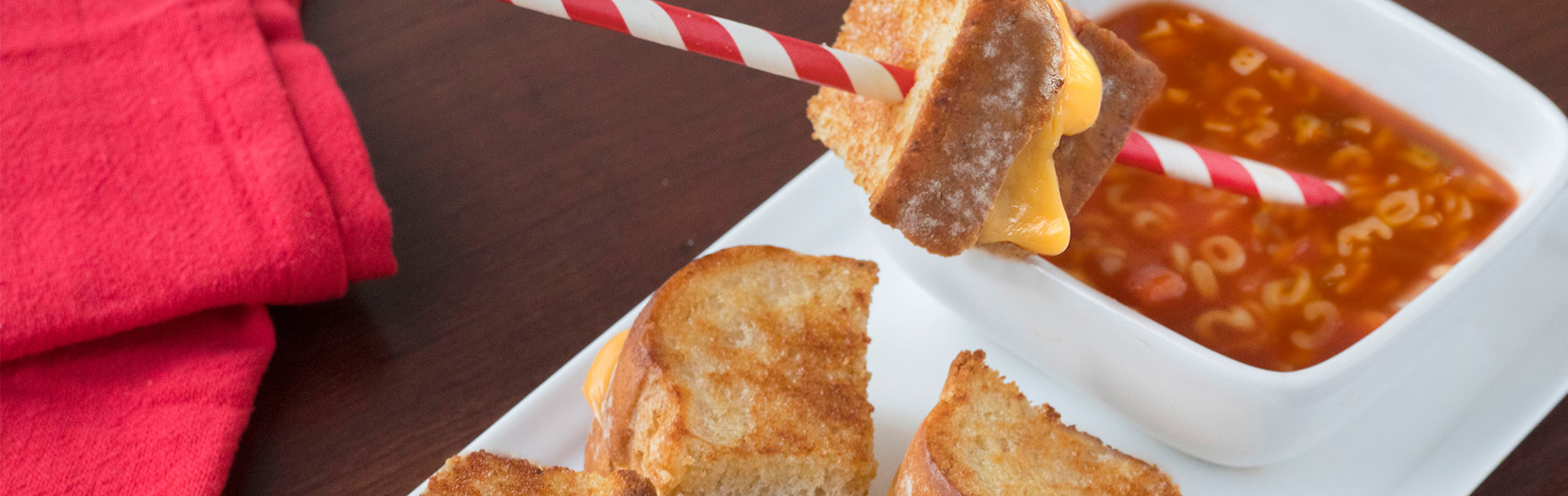 - Cut grilled cheese sandwich into quarters and thread straw through the middle, like a skewer. Serve with alphabet soup.