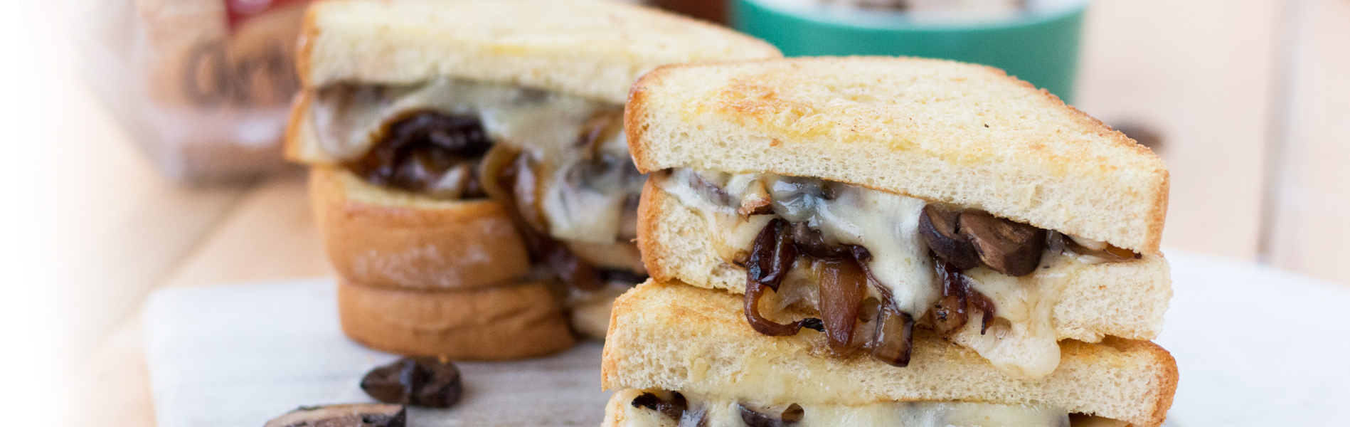 - Using same skillet, melt 1 tablespoon butter over medium-low heat. Top 2 slices of bread with 1 slice cheese, caramelized onions, mushrooms and remaining cheese slices. Butter 1 side of remaining bread slices and place, butter side up, atop sandwiches.