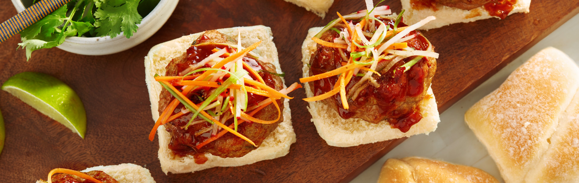 - Slice rolls in half. Arrange halves, cut side up, on a large serving platter. Place 1 meatball on each roll half. Top with extra sauce, if desired, and pickled veggies before serving.