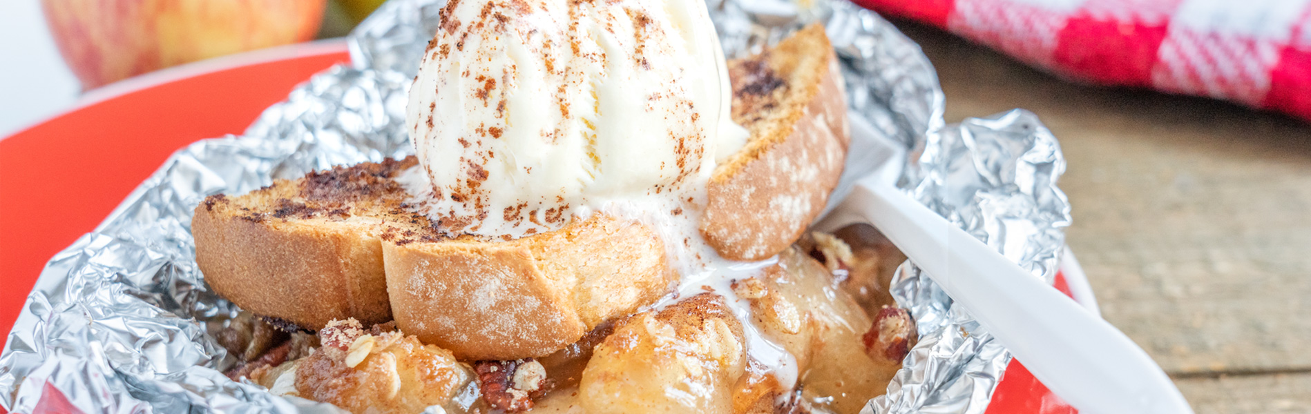 - Remove from the oven and allow it to cool slightly before serving, in foil pouches, topped with vanilla ice cream and a sprinkle of cinnamon.