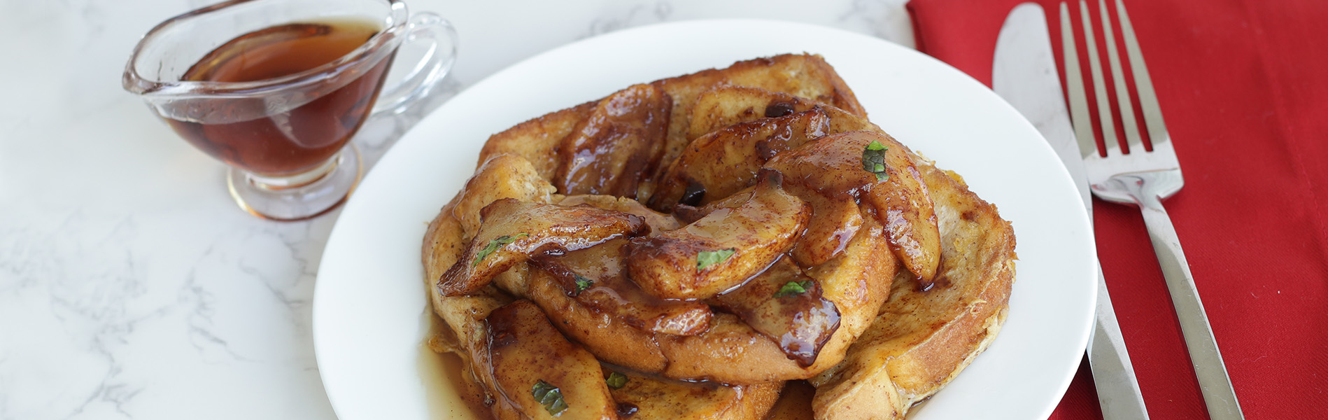 - In a large skillet on medium heat, cook slices until lightly browned, about 1-2 minutes per side. Remove and place onto a serving plate. Repeat with all the slices. Generously top with apple-cinnamon mixture. Enjoy!