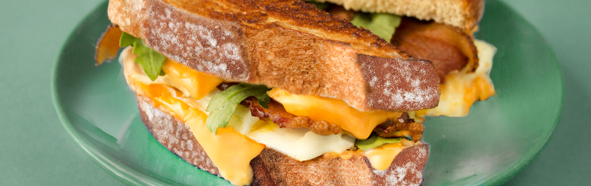 - Heat skillet over medium heat. Butter one side of each slice of bread. Place one slice of bread in skillet, butter side down. Layer on the first slice cheese, followed by egg, bacon, arugula and the second slice of cheese. Top with second slice of bread, butter side up.