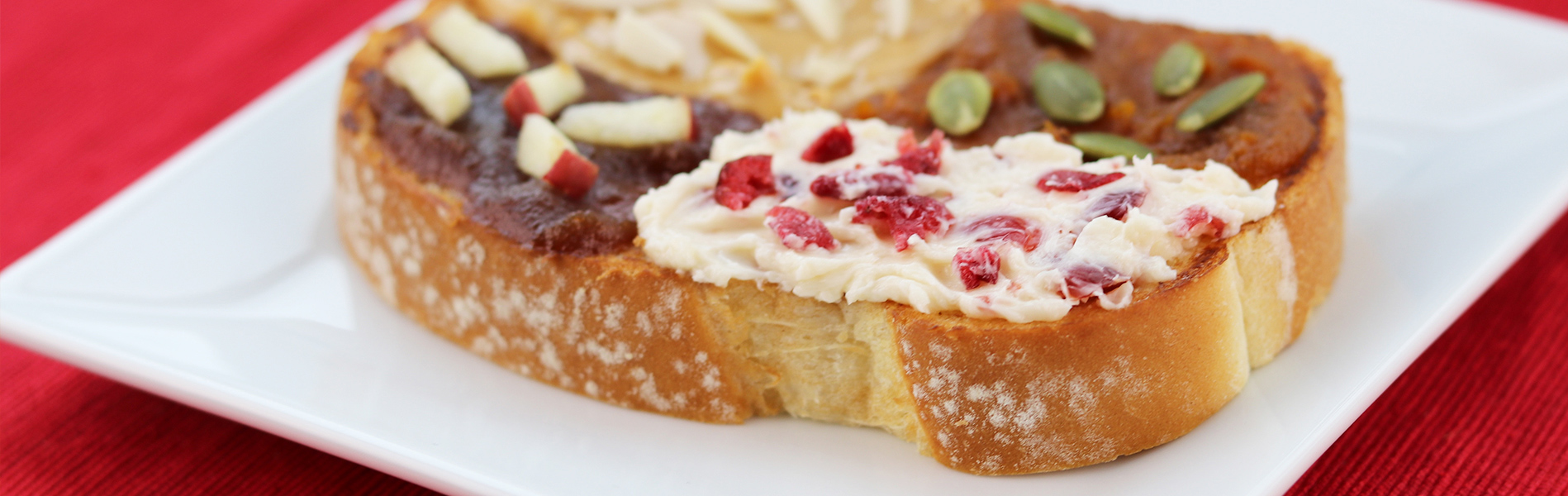 - On the last slice, spread pumpkin butter and sprinkle with pumpkin seeds.