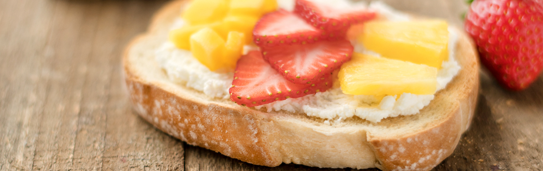 - Spread Ricotta evenly on both slices of bread. Top each with desired amount of pineapple, strawberries and mango. Enjoy!