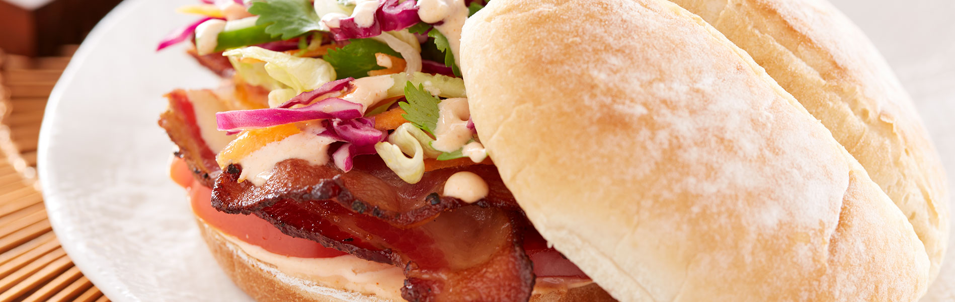 - Top bottom bun with Yum Yum sauce, tomato and cooked bacon. Scoop desired amount of slaw on top of the bacon and a drizzle of Yum Yum sauce. Garnish with cilantro and cover with bun lid.