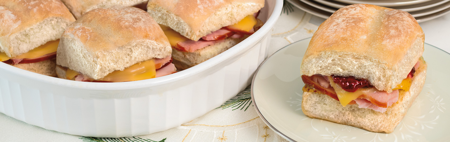 - Cut each roll in half, keeping one side attached. Generously spread mayonnaise onto the bottom half of each roll, and layer on slices of ham, Gruyére cheese and cranberry sauce. Cover with roll lids. Place into a 9x12 baking dish.