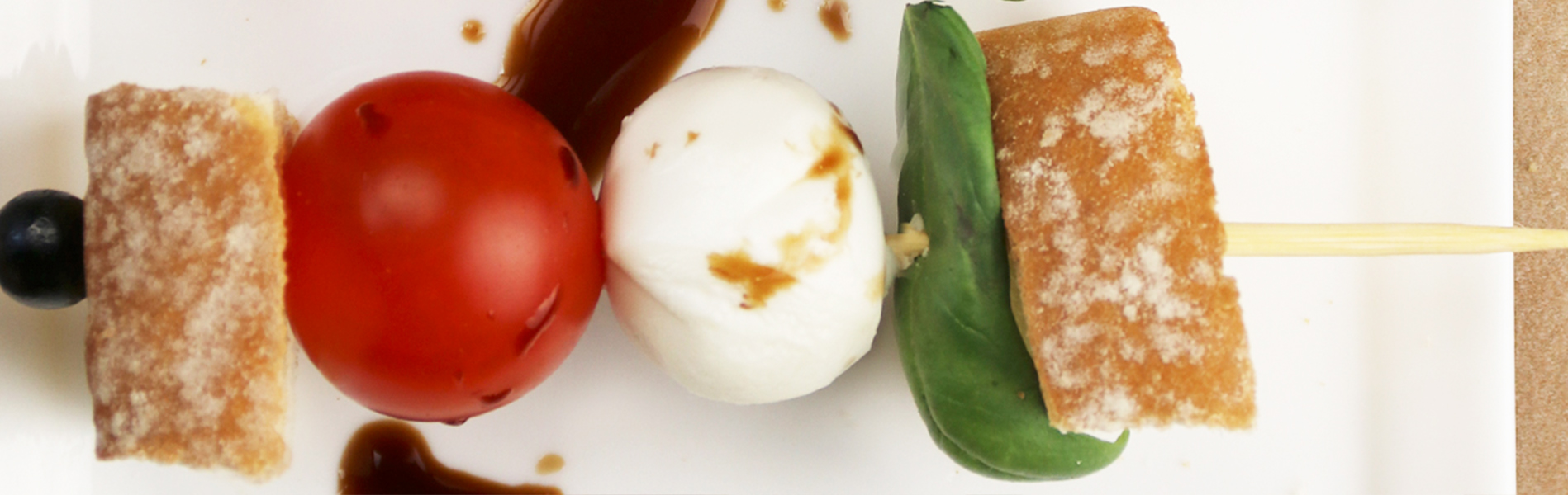 - Toast bread and cut into cubes. Thread 1 bread cube onto a skewer, followed by 1 tomato, 1 Mozzarella ball, 1 basil leaf and 1 more bread cube. Repeat with remaining skewers.
