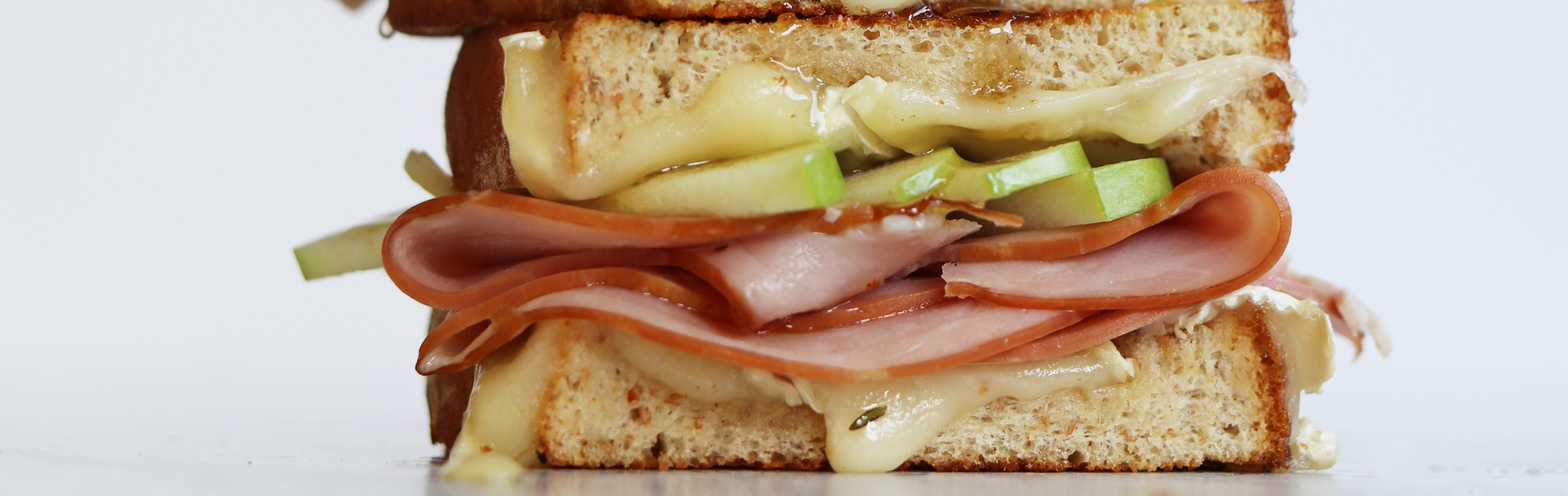 - Place two slices of bread on a cutting board and drizzle each slice with honey. Add half of the Brie to one slice followed by the sliced apples and the smoked ham. Add the remaining Brie on top and cover with the remaining slice of bread, honey side down. Evenly smear the thyme butter onto both exteriors of the sandwich and set aside.