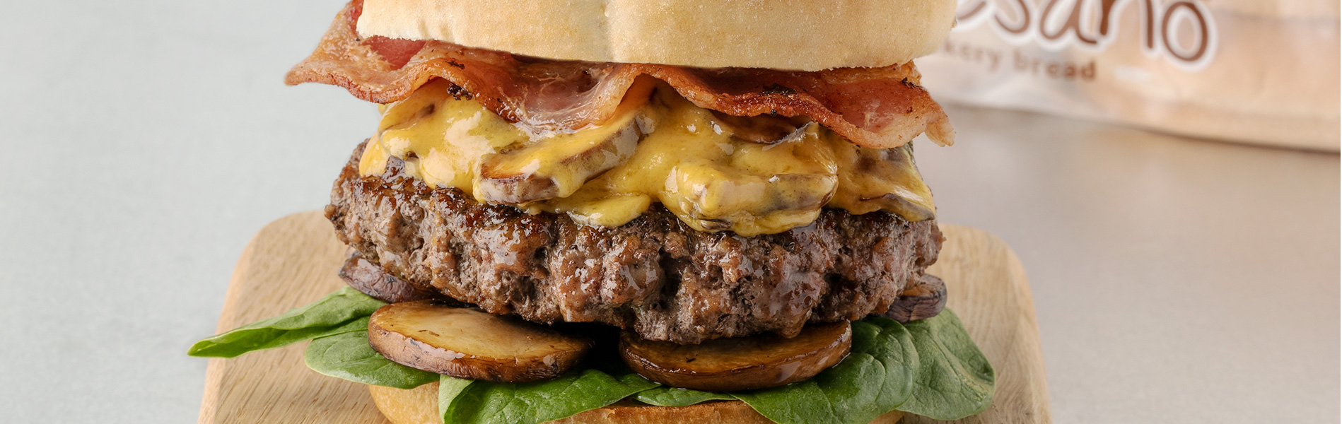 - On each bun bottom, layer spinach, cooked mushrooms and 1 grilled burger patty. Spoon cheesy garlic mushroom sauce over the top, then layer on crispy bacon. Top each with a toasted bun lid and enjoy!