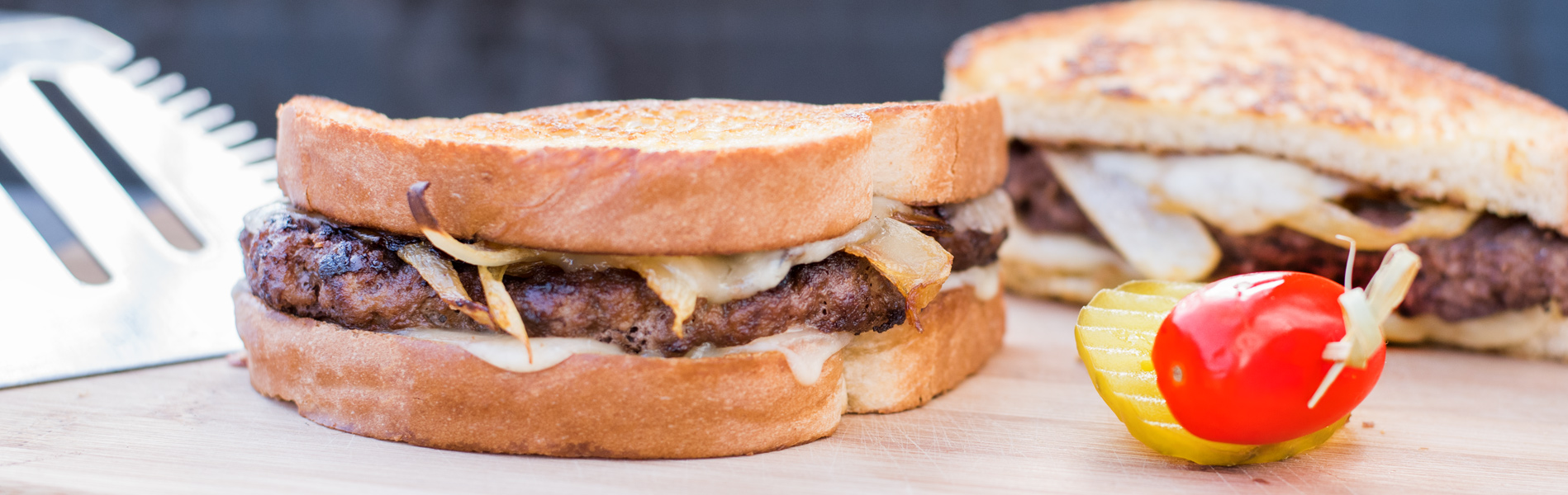 - Use remaining butter to butter 1 side of each bread slice. Toast on grill until golden brown. Assemble the patty melt by layering 2 toasted bread slices with 1 cheese slice, 1 beef patty and some onions. Top each with remaining cheese and toasted bread slices.