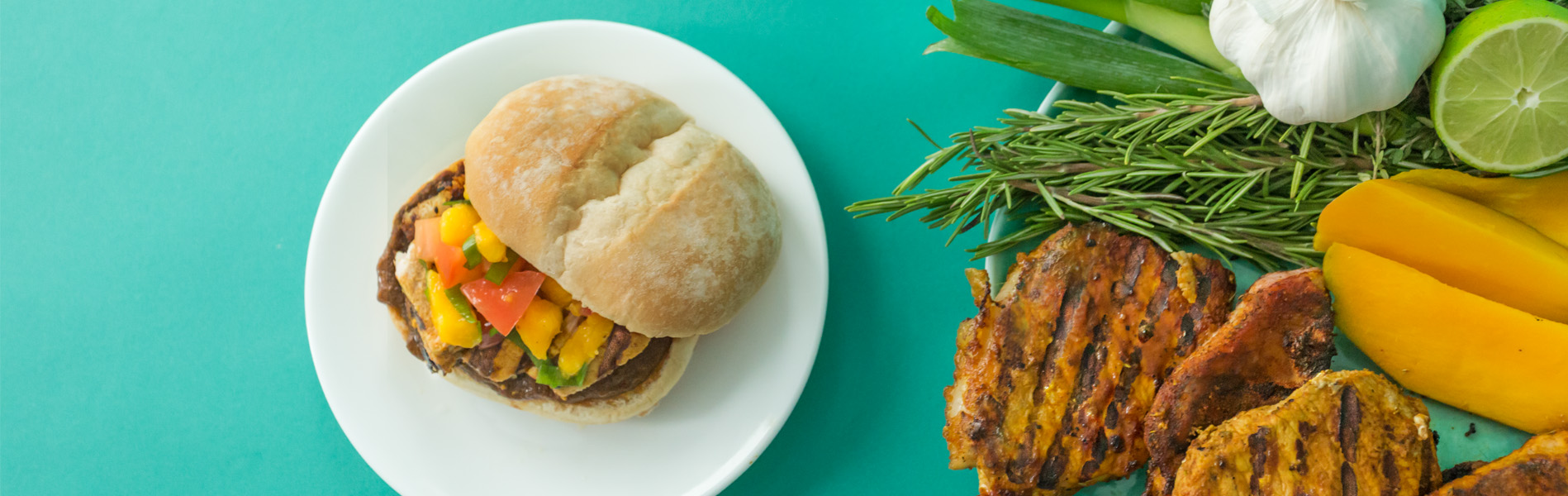 - Spread remaining Jerk Sauce on bottom half of each bun. Layer on 1 grilled pork chop and mango salsa. Cap with the bun lid and serve!