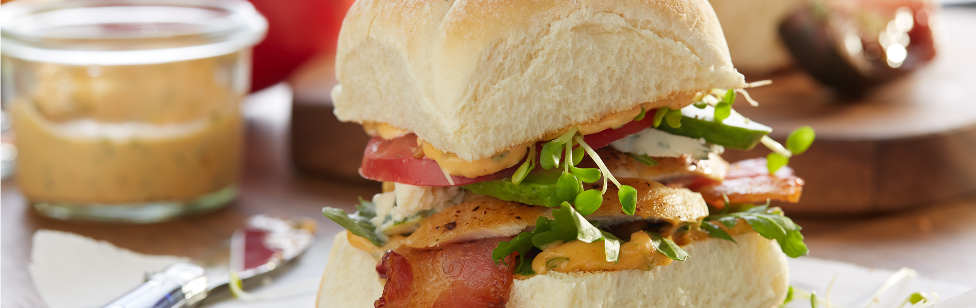 - Combine chipotle mayonnaise ingredients in a food processor and pulse until smooth. Spread on each roll half. Arrange arugula, chicken, Bleu cheese, tomatoes, avocado, 2 slices bacon and sprouts on each roll bottom. Cap each with roll tops, secure with long toothpicks and serve.