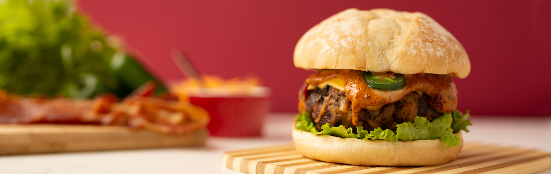 - Heat grill to medium. In a large mixing bowl, combine ground beef, bacon, Cheddar cheese, onions, jalapeños and chili sauce. Mix until well combined. Shape into 4 patties and set aside.