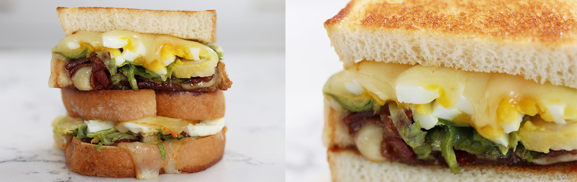 - Top 1 bread slice with 1½ slices of the Muenster cheese. Top with Brussels sprouts, sliced egg, quick candied bacon and remaining cheese. Cap with second bread slice. Spread half the butter on top slice of bread and set aside.