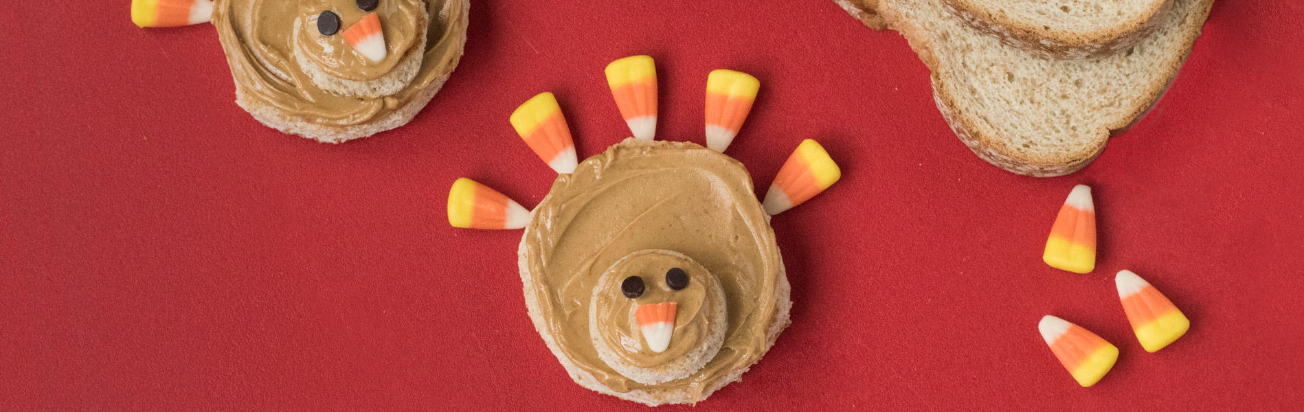 - Spread peanut butter on one side of each bread circle. Place small circle on top of medium circle. Decorate each with two chocolate chips for eyes, half of a piece of candy corn for the mouth, and 6 full pieces of candy corn for turkey feathers.